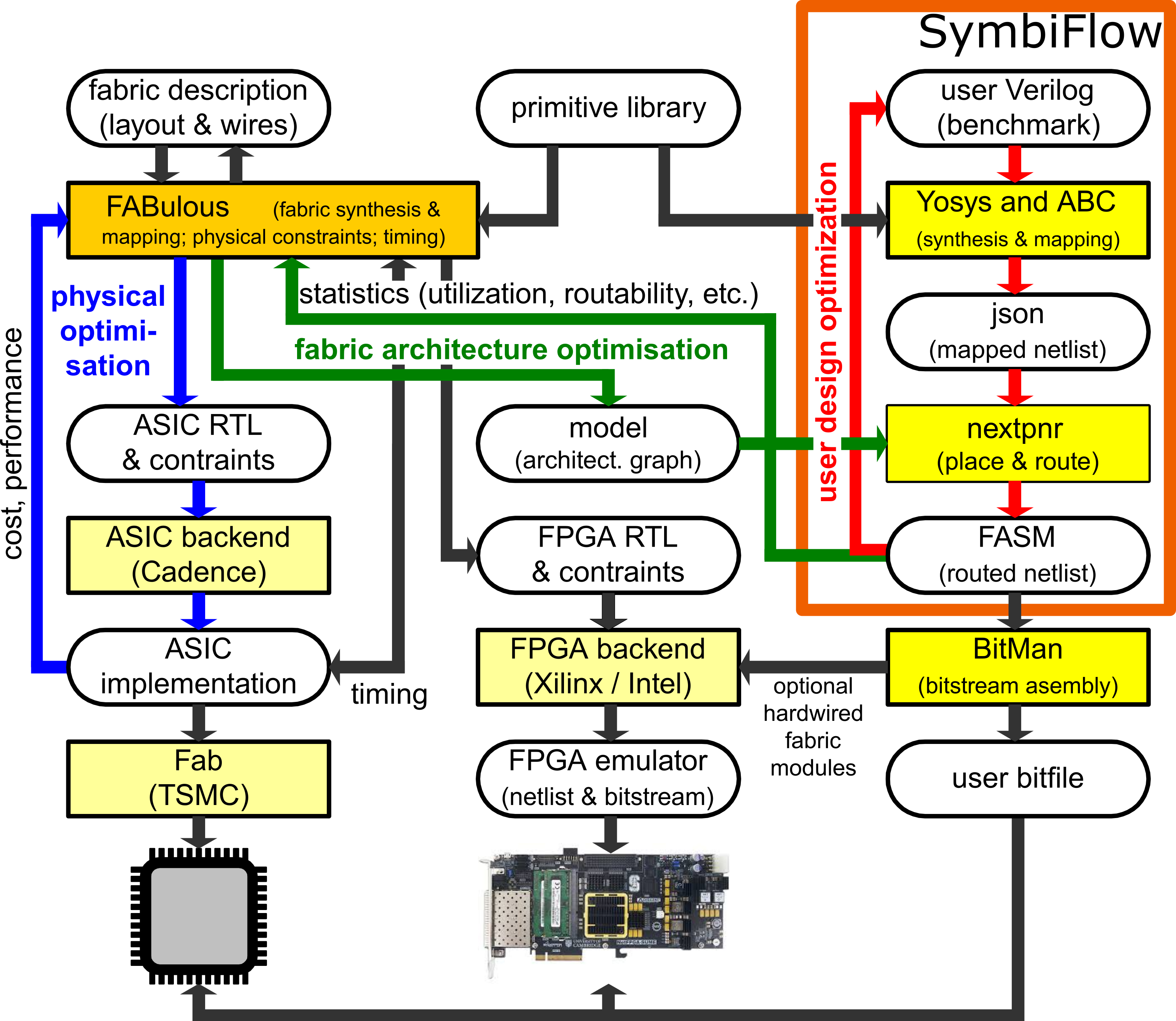 What it does β FABulous generates complete embedded FPGA fabrics and supporting flows for synthesis, place-and-route, bitstream generation, and GDSII physical design.