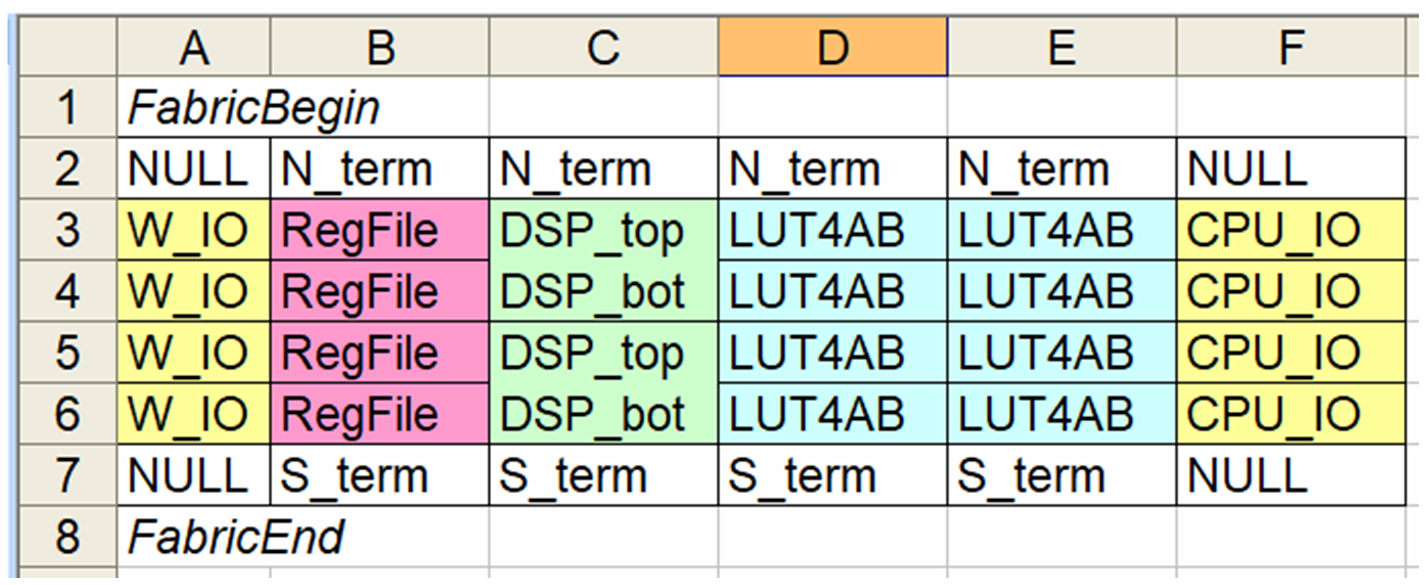 FABulous models FPGA fabrics as simple CSV files that describe the fabric layout in terms of Tiles. A tile is the smallest unit in a fabric and typically hosts primitives like a CLB with LUTs or an I/O block. Multiple smaller tiles can be combined into Supertiles. The following figure shows the fabric.csv representation of our example fabric as shown in a spreadsheet program.