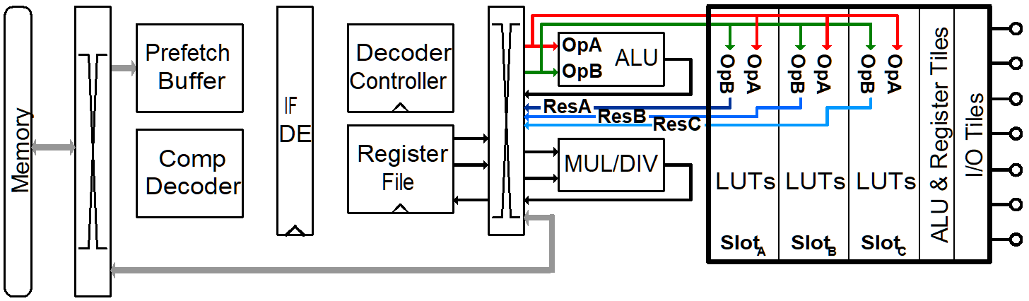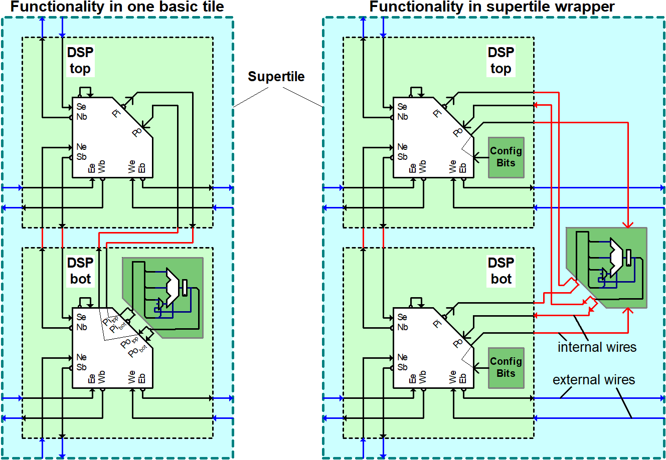 With the instantiation of multiple basic tiles, we define mostly the part related to the routing fabric. The actual functionality of a tile can be either concentrated in one basic tile or inside the supertile wrapper or as a combination of both. The following figure shows this for a simple DSP block example: