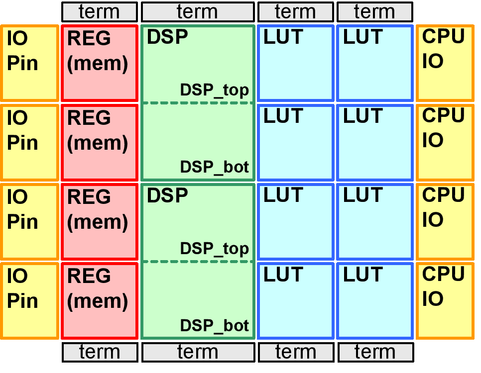 The left example concentrates the DSP functionality in the bottom tile and is modelled as shown in the next code block. (Note the two extra NORTH and SOUTH wires that provide the connections between the DSP BEL (located bot) and the top basic tile).