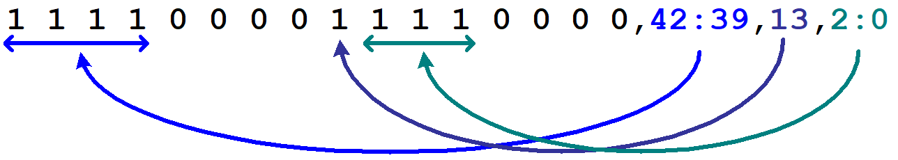 1denotes a used configuration bit, while a0denotes a gap bit that will not be used. Note that FABulous will not generate a configuration latch for those gap bits. Again, in frame-based reconfiguration, not all possibleFrameBitsPerRowxMaxFramesPerColbits will usually be used and the bitmask specifies the used and unused bits. The number of1entries per frame is redundant to <bits_used>. FABulous will count the1entries and use that value while <bits_used> is used for checking only.<ConfigBits_ranges> denotes a comma-separated list of configuration bits (given by their index) from the tile bitstream. The field can be individual bits or ranges of tile bitstream bits in the form <left_index>:<right_index>. The number of specified bits has to match the number of used configuration bits as specified by the mask and the mapping is performed in the order the configuration bits are listed, as illustrated in the following figure: