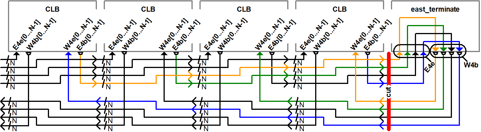 Supertiles will be instantiated in the fabric (VHDL or Verilog) file, and supertiles themselves instantiate basic tiles (e.g., the ones shown in the figure). Therefore, supertiles define wires and switch matrices through their instantiated basic tiles.