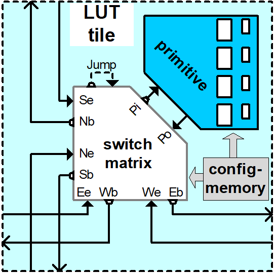 For customization of tiles or the creation of new blocks, it is possible to model the routing wires, a central switch_matrix and primitives