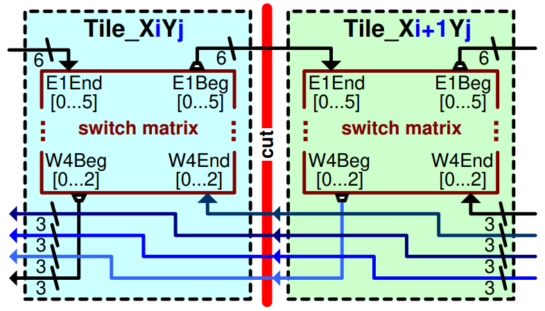Supertiles are needed for blocks that require more logic and/or more wires to the routing fabric (e.g., as needed for DSP blocks). Therefore, supertiles will normally provide as many switch matrices as they integrate basic tiles. However, larger supertiles (e.g., hosting a CPU or similar) may only provide switch matrices in basic tiles located at the border of such a supertile. In any case: supertiles must provide wire interfaces that match the surroundings when stitching them into a fabric.